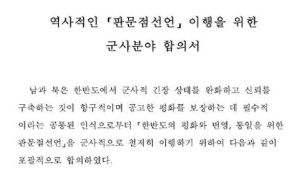 · 적대행위 중지 : 남과 북은 지상, 해상, 공중을 포함한 모든 공간에서 서로에 대한 적대행위를 전면 중지하기로 했습니다. 이는 무력 충돌 방지와 상대방 관할구역에 대한 침입이나 공격을 금지하는 것을 포함했습니다.